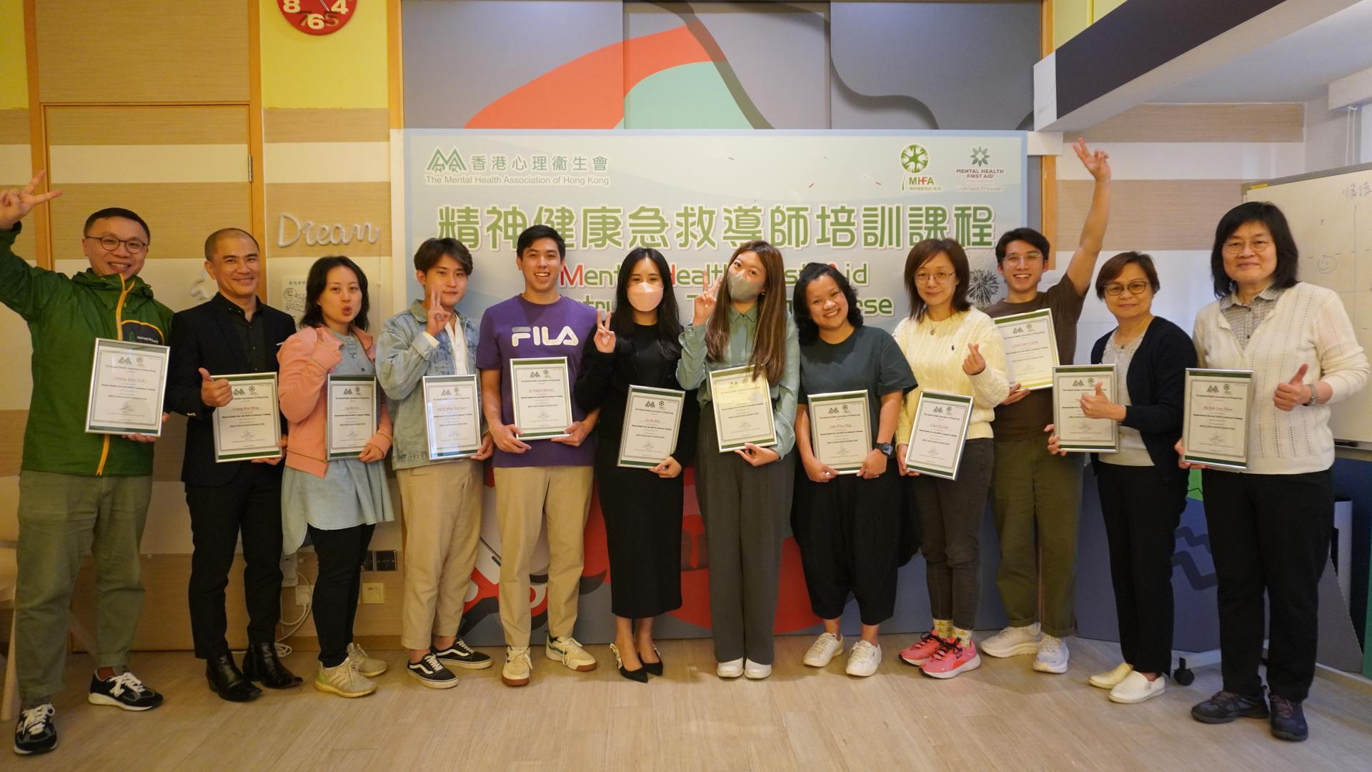 2023年12月本會舉辦第四十八屆「精神健康急救標準版導師課程」,報名反應熱烈,經面試篩選後,共收取12名學員。本屆課程由本會首席企業培訓顧問黃廷儼先生、李鄭屋宿舍服務經理洪美清女士、敦睦軒服務經理趙展榮先生、賴子健醫生(精神科專科)、李永堅醫生(精神科專科)、李靖國醫生(精神科專科)及楊麗瑩博士(資深臨床心理學家)擔任講者。黃廷儼先生及洪美清女士負責擔任學員表現評審工作,並由本會總幹事程志剛先生頒發證書。再次恭喜各位畢業學員!